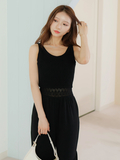 ウエストのクロシェ切り替えがメリハリのある印象を与えるロンパース。