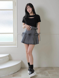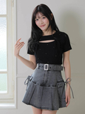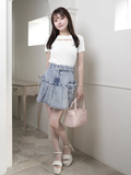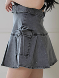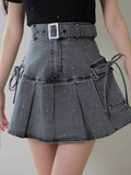 ・デニム素材×プリーツ×ストーンの組み合わせでシンプルトップスと合わせても映えるコーデに!