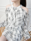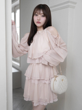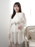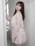 ・袖はオープンショルダーのドレープスリーブで肌見せと立体感が女性らしい雰囲気。