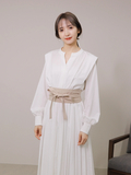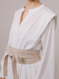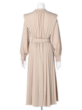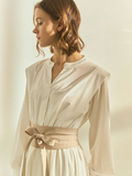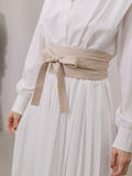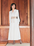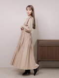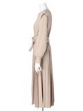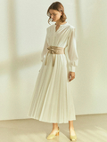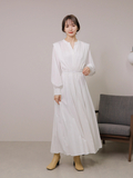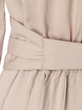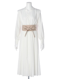 ウエストをきゅっと引き締めるサッシュベルト付きのワンピース。