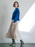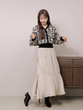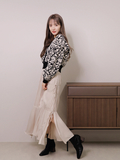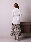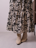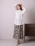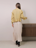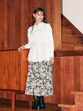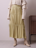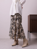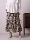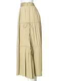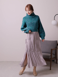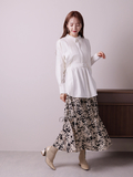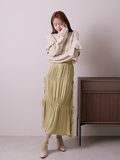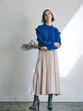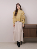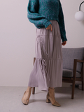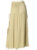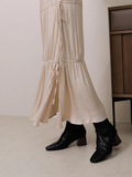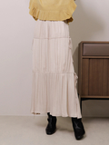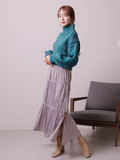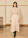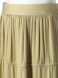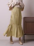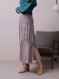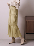 上品な艶と落ち感のあるサテン生地を使用した、フェミニンムード満点のティアードスカート。細やかなギャザー使いやサイドのリボンディティール、裾のディープスリットもエレガントさを引き立たせてくれるデザイン。両サイドに施したドロストリボンを調節することで、フォルムアレンジも可能。ロング丈ながらも揺れるシルエットで軽やかにスタイリングできるのも魅力です。